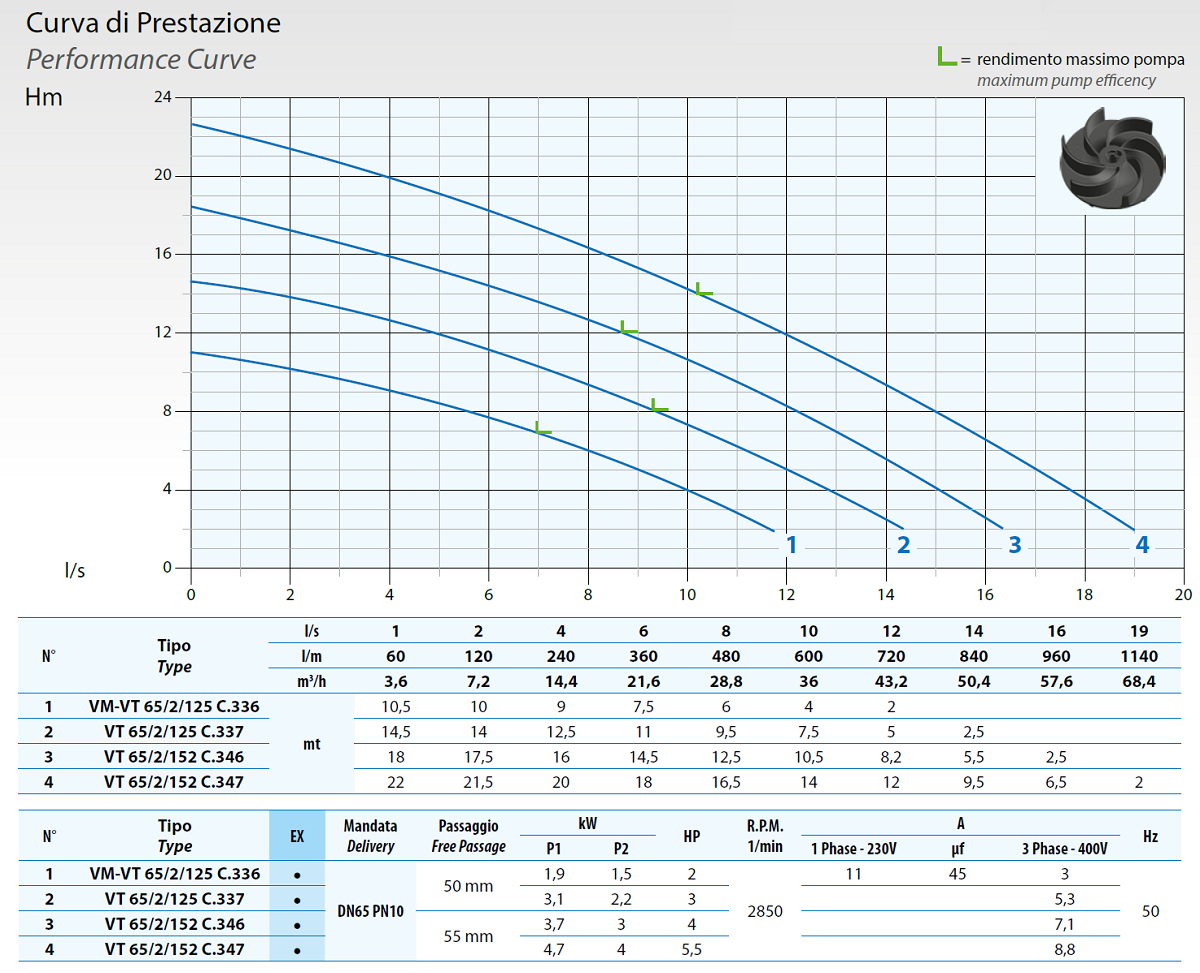 Einsetzbar sowohl in leicht als auch stark verschmutztem Wasser mit größeren Feststoffen. Diese Pumpen können im Dauerbetrieb arbeiten, sofern der Motor zu 2/3 untergetaucht ist. Diese Pumpen sind aus Gusseisen (EN GJL200) mit Wirbelrad aus Gusseisen hergestellt. Motor Klasse F mit IP68, Click-son 130°C. Die doppelte Gleitringdichtung besteht aus einer Gleitringdichtung auf der Motorseite und einer SiC/SiC-Viton-Wellendichtung (Siliziumkarbid), die in einem separaten Ölbad auf der Laufradseite rotiert. Die Pumpen werden mit einem 10 m langen Standardkabel H07RN-F geliefert; 230 V-Typen mit externer Kondensatorbox und Stecker (2-polig, 2850 U/min). Atex explosionsgeschützte Ausführung (CE 2049 Ex II 2 G Ex d c IIB T4 X).